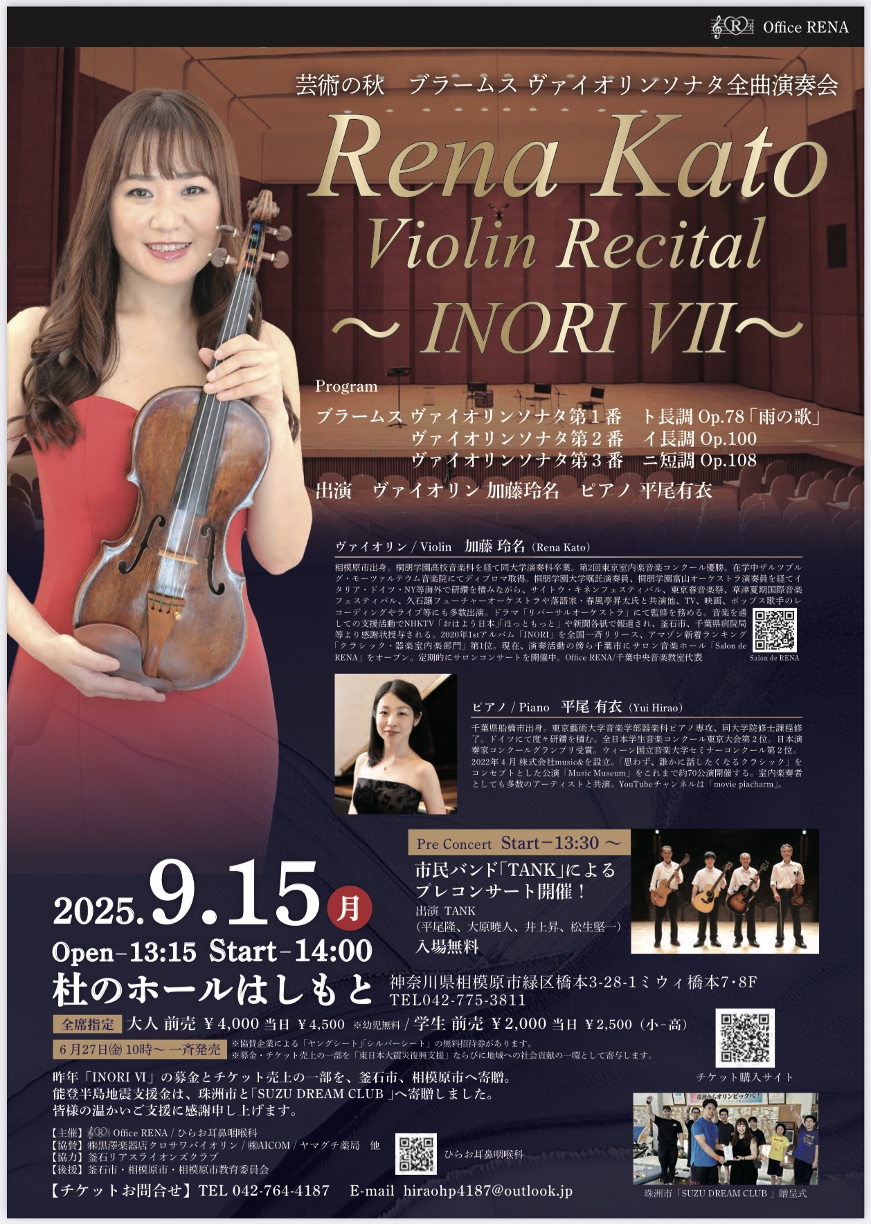相模原出身のヴァイオリニスト、加藤玲名さんが 2019年より“Rena Kato Violin Recital~INORI~”を橋本付近で開催。過去6年間で多くの方が生のヴァイオリンの音色に酔いしれ感動し、コロナ禍でも癒やしとなる時間を過ごしてきました。